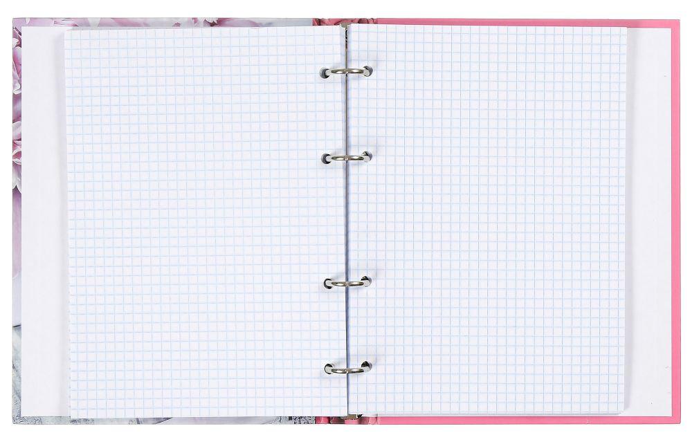 Тетрадь на кольцах представлена в А5 формате. Блок сделан из белой бумаги и состоит из 120 листов в клетку. Тетрадь снабжена разделителями. Цвет обложки - ассорти.
